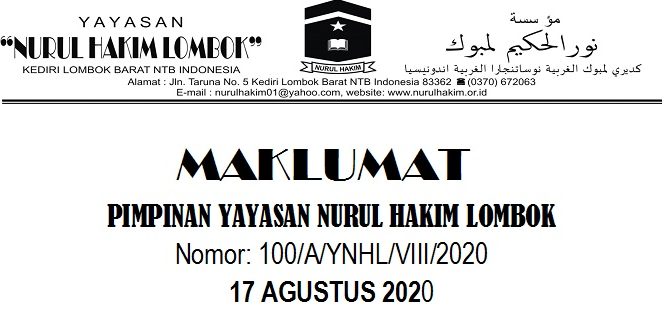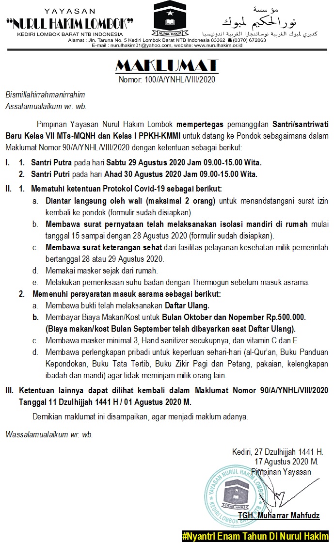 Pimpinan Yayasan Nurul Hakim Lombok MEMPERTEGAS Pemanggilan Santri/santriwati Kelas VII MTs-MQNH dan Kelas I PPKH-KMMI sebagaimana tertuang dalam Maklumat Nomor 90/A/YNHL/VIII/2020 Tanggal 01 Agustus 2020.